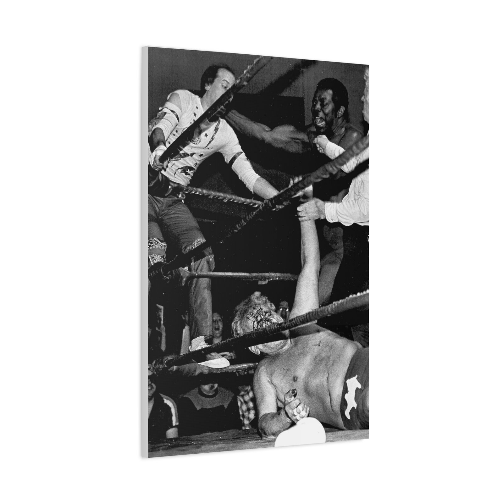 💥 Blood. Chaos. Wrestling History. This is not just a canvas print—it’s a front-row seat to mayhem. Manager Supermouth Dave Drason finds himself in the eye of the storm as the wild and unpredictable Sheik unleashes fury on the legendary Bobo Brazil! This isn’t a posed shot—this is real, raw, and ruthless action from the golden age of wrestling, captured forever on a massive 24×36-inch premium canvas.